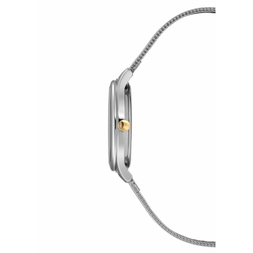 Damski zegarek na stalowej bransolecie typu mesh japońskiej marki Citizen, model Eco-Drive EM0504-81A. Mechanizm eco-drive zasilany dowolnym źródłem światła. Tarcza jasna, ochrania ją szkiełko mineralne. Wskazówki, indeksy oraz koronka w kolorze złotym. Wodoszczelność na poziomie 5ATM (50 m) , to dodatkowy atut tego klasycznego i eleganckiego modelu.
