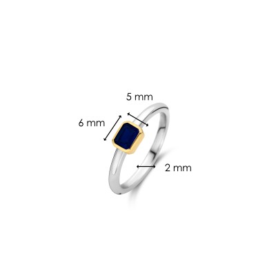 Granatowa kamienna słuchawka w pozłacanej oprawie. Pierścionek jest wykonany ze srebra próby 925 i pokryty grubą warstwą rodu, aby go chronić i zachować jego blask.