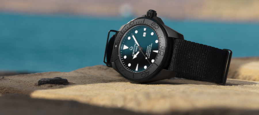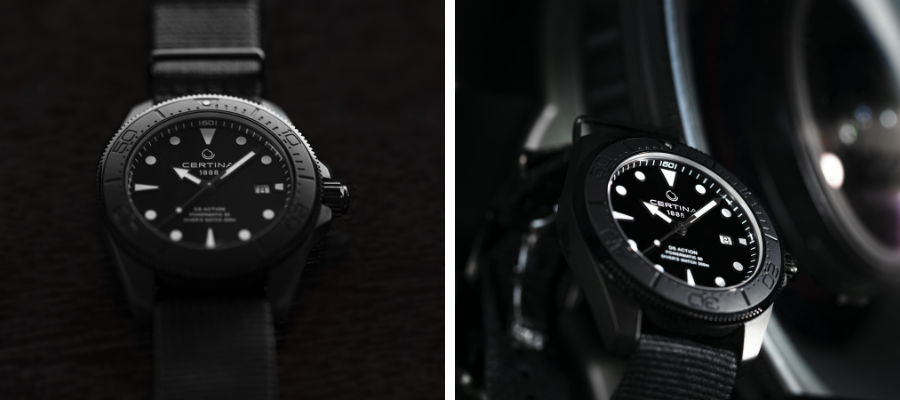 Nowy model Certina DS Action Diver 43 mm powstał w całości w kolorze czarnym, w tym koperta ze stali, obrotowy bezel i pasek NATO. Wszystko to zostało ujednolicone kolorystycznie, by podkreślić klasyczny, ale zarazem sportowy styl czasomierza.