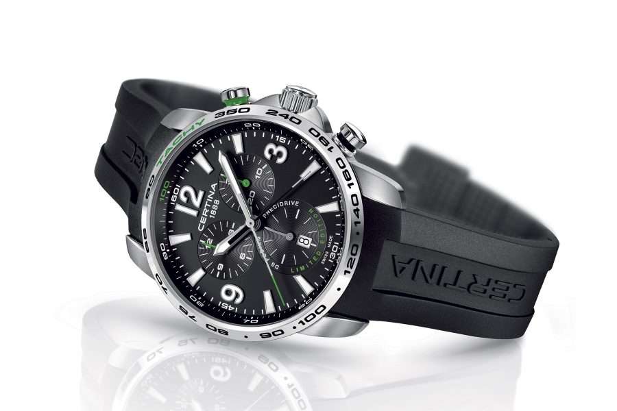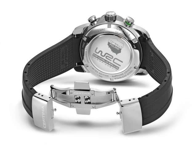 Limitowany model WRC (World Rally Championship) Certiny DS Podium Big Size Chronograph posiada kwarcowy mechanizm Precidrive, który zapewnia dokładny do 1/100 s stoper, jak również pomiar czasu z precyzją + / - 10 sekund na rok. Na czarnym cyferblacie na godzinie 6 umieszczony został datownik. Kolorystyka limitowanej na Polskę Certiny to przede wszystkim kolor czarny z nielicznymi akcentami białego i zielonego. Wodoszczelność Certiny DS Podium jest równa 200m. Stalowa koperta posiada zakręcaną koronkę. Zegarek wart jest uwagi również poprzez dwustronny antyrefleks, bezel ze skalą tachymetru i gumowy pasek z motylkową klamrą. Na stalowym deklu widnieje logo WRC, a nad nim wygraweronwany został kontur mapy polski i informacje o 73 edycji rajdu. Dodatkowo na obwodzie dekla wybity jest numer egzemplarza. Cała seria, jak pisaliśmy powyżej, to 555 sztuk na Polskę.