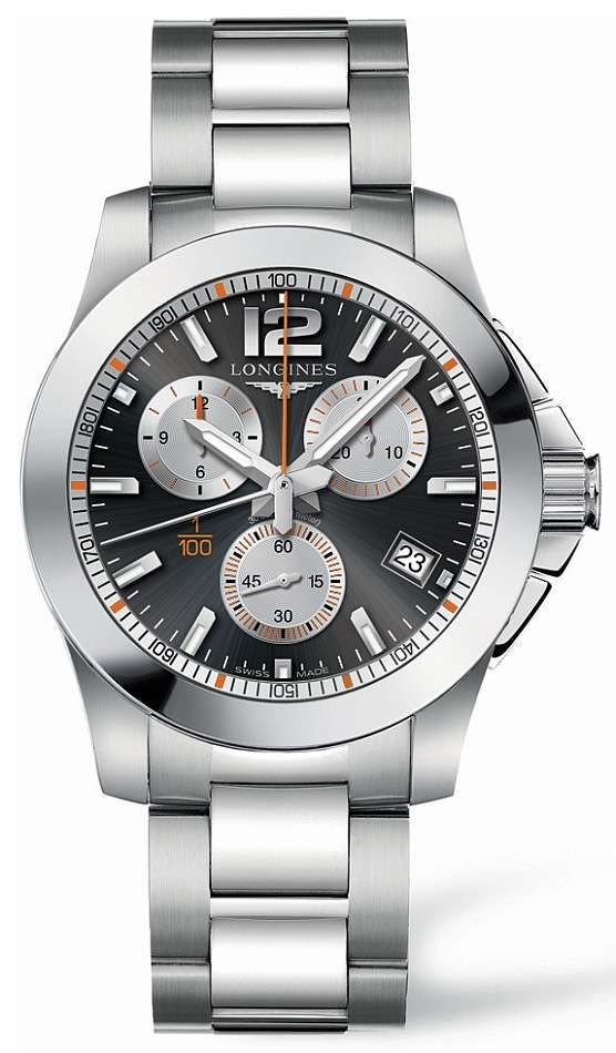 Męski model Longines Conquest 1/100th Roland Garros doskonale odpowiada na potrzeby sportowców, sędziów i zagorzałych fanów sportu. Pomarańczowe akcenty na wskazówkach, na tarczy, czy na skali sekundowej to subtelne nawiązania do legendarnej mączki z kortów French Open. Dekiel zegarka zdobi logo Roland Garros. Oczekiwania ekstremalnego poziomu precyzji doprowadziły do opracowania nowego mechanizmu kwarcowego – L440. Model ten posiada zintegrowany mikrokontroler z pamięcią flash, dzięki któremu stoper zegarka można w mgnieniu oka zresetować oraz zapamiętać międzyczasy. Czasomierz w stalowej kopercie o średnicy 41 mm ma antracytową tarczę ze wskazaniami godzin i minut, małym sekundnikiem na godzinie 6 oraz okienkiem datownika. Za funkcje chronografu odpowiadają centralny sekundnik, licznik 30-minutowy na godzinie 2 i licznik 12-godzinny na godzinie 10. Centralna pomarańczowa wskazówka to licznik setnych części sekundy i chluba tego modelu. Zegarek wyposażono w stalową bransoletę z zapięciem motylkowym.