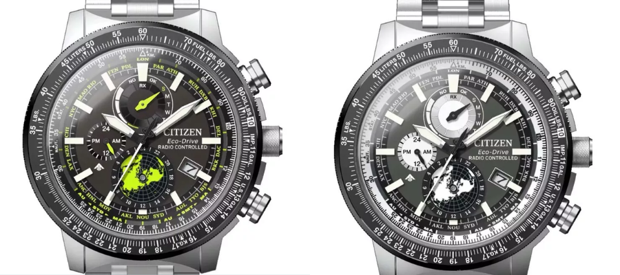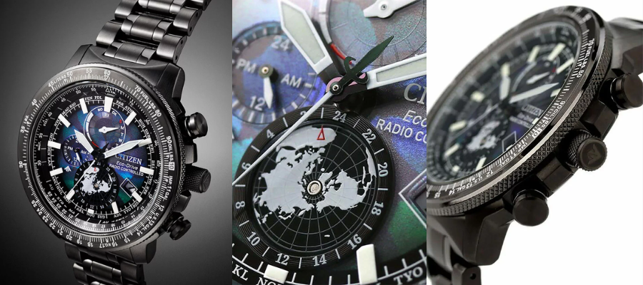 Na froncie obudowy znajduje się czarny pierścień ze skalą do kontrolowania zużycia paliwa — jest to niezwykle przydatna funkcja, na przykład dla pilotów. Tarcza z unikatowej wzornictwem masy perłowej czasomierza Citizen chwali się dużą funkcjonalnością. Znajdują się na niej subtarcze do kontrolowania i obserwacji funkcji takich jak chronograf, wieczny kalendarz, czas dobowy 12/24h, czas światowy, wskaźnik naładowania akumulatora oraz datownik. W słabych warunkach oświetleniowych tarczę podświetla masa luminescencyjna.