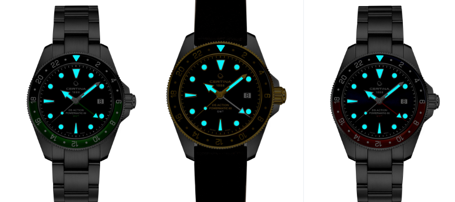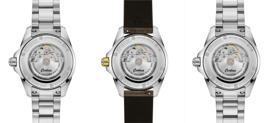 Nowa Certina jest dostępna w 3 wersjach kolorystycznych, z niebieską tarczą udekorowaną szlifem słonecznym i niebiesko-czerwoną wkładką bezela ze szkła, z czarną tarczą oraz czarno-brązową wkładką oraz czarną tarczą uzupełnioną o czarno-zieloną wkładkę.