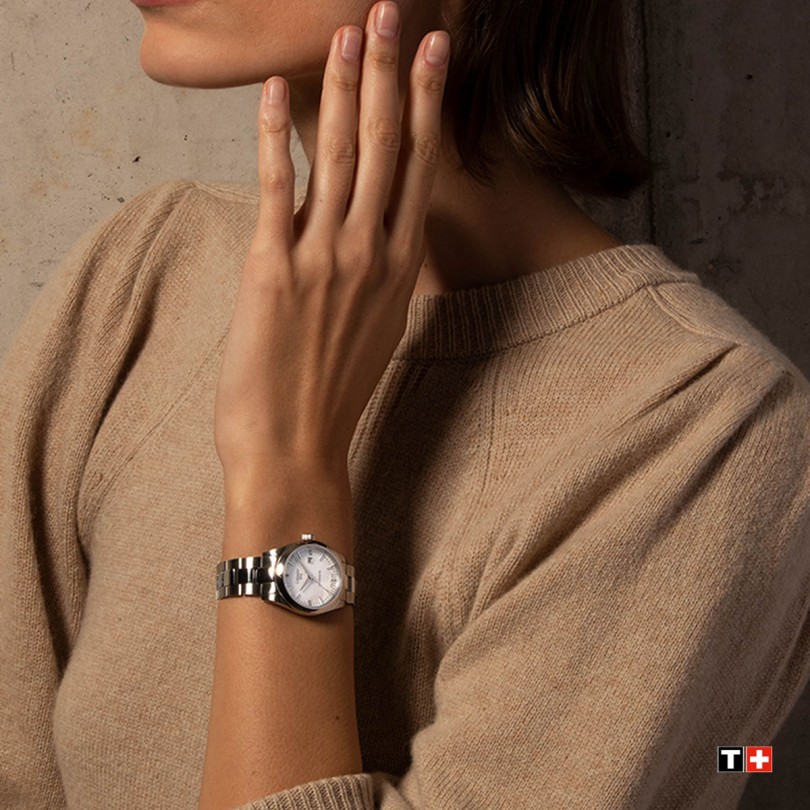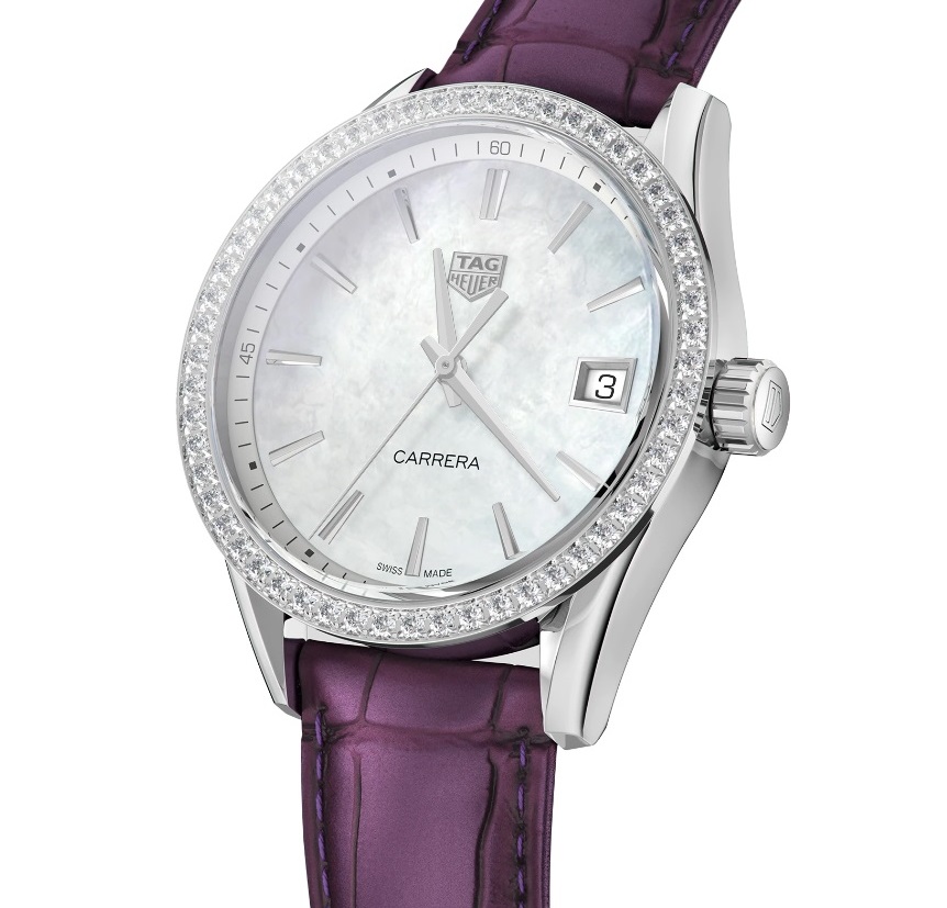 Tarcza pokryta masą perłową, lśniące diamenty na indeksach. Odpowiedni wybór dla aktywnej kobiety, która ceni sobie wytrzymałość czasomierza a zarazem jego elegancje.