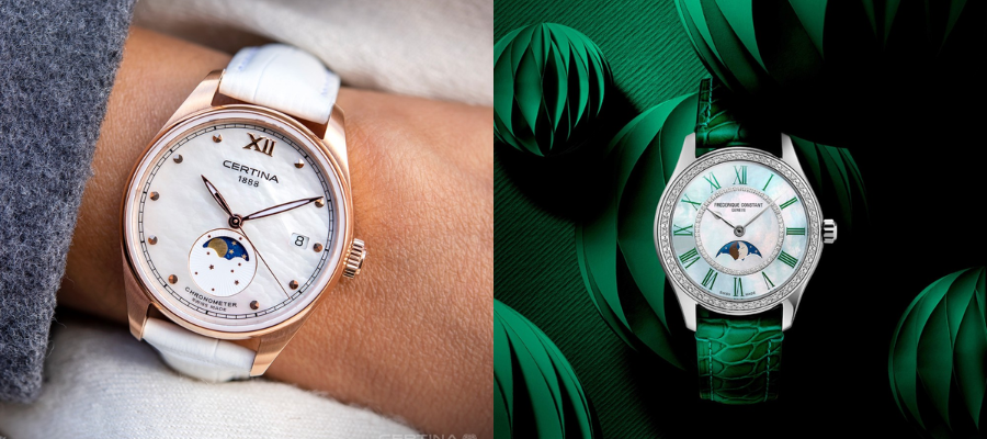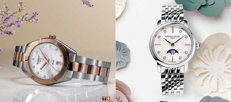 * Tarcza z masy perłowej- tarcza pokryta pięknie mieniącą się masą perłową. Masa perłowa zmienia swój wygląd z zależności od padającego światła. Tarcza pokryta masą perłową dodaje elegancji, kunsztu i zegarkowi.
