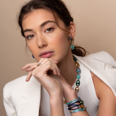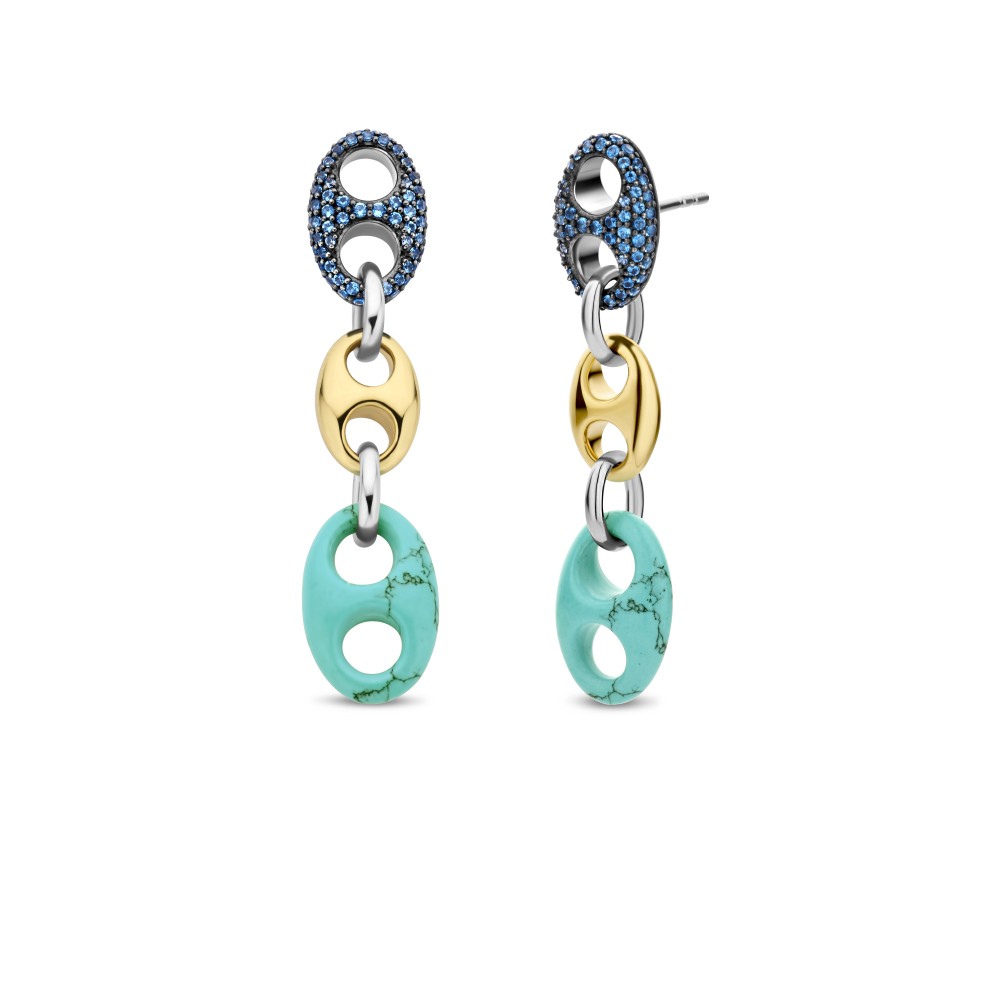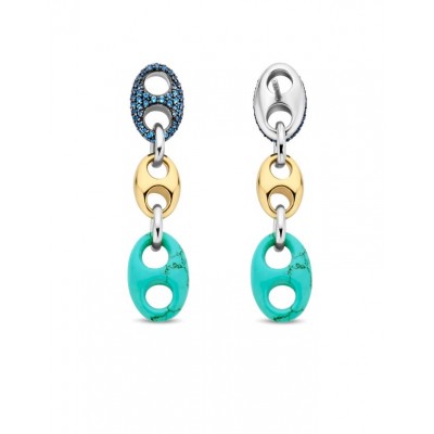 Pozłacane srebrne kolczyki drop 7881TQ przedstawiają strumień trzech żetonów ziaren kawy w kolorze turkusowym, pozłacanym i lapis blue pavé. Te klasyczne kształty ziaren kawy zostały przeprojektowane z odrobiną figlarnej kanciastości. Kolczyki wykonane ze srebra próby 925.