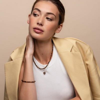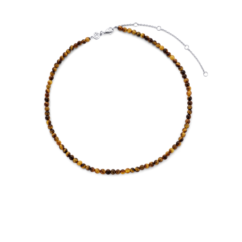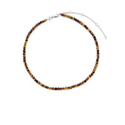 Ten srebrny naszyjnik TI SENTO - Milano 3912TE/42 ma strumień brązowych koralików w kształcie tygrysiego oka. Naszyjnik wykonany ze srebra próby 925. Jego długość jest regulowana, zakres to 38-48cm.