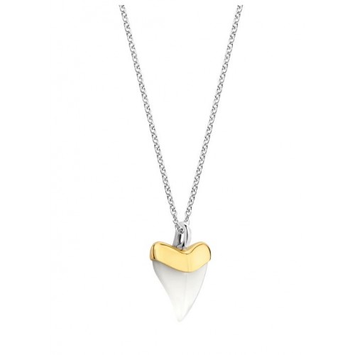 Pozłacany wisiorek (6816WM) w mleczno-białym kolorze, o trójkątnym kształcie, osadzony jest ręcznie w wyrafinowanej, pozłacanej oprawie. Jego sylwetka inspirowana jest kształtem zęba rekina. Przypomnij go do wyrazistego naszyjnika, mieszaj i łącz z innymi symbolami oceanu lub noś solo.