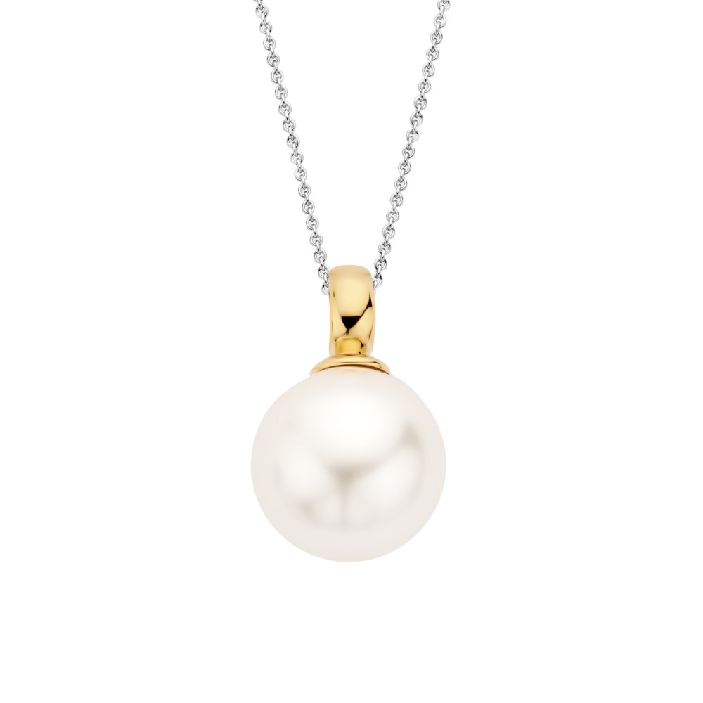 Duża, idealnie okrągła perła, trzymana przez złotą zawieszkę. Model klasyczny, kobiecy i ponadczasowy.