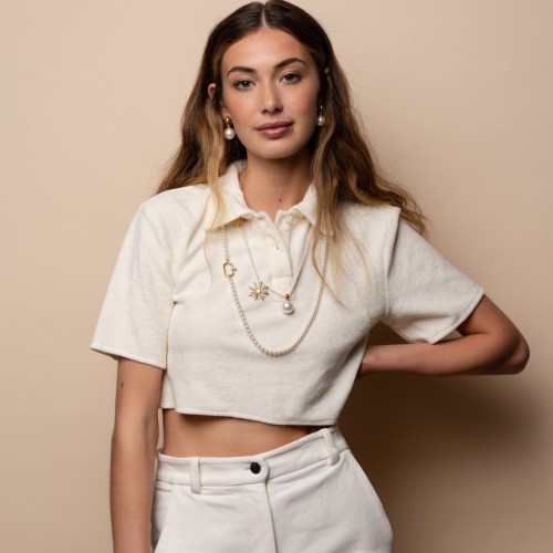 Zawieszka wykonana ze srebra pr 925 pokrytego złotem, zdobiona perłą. Sprzedawana w komplecie ze srebrnym łańcuszkiem (48cm).